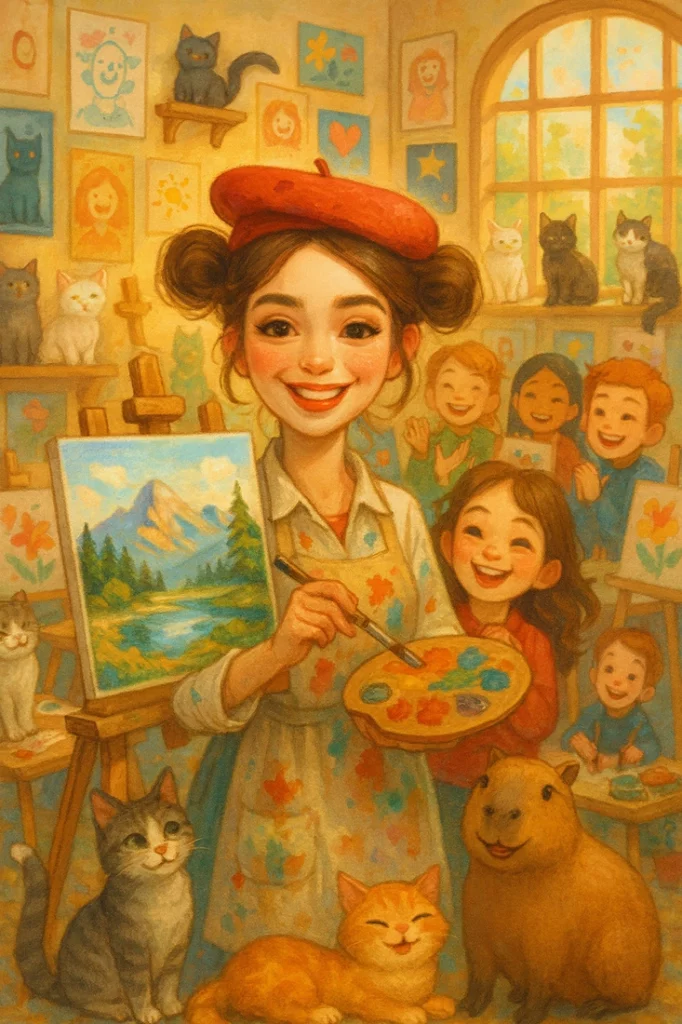 Pembe tonlarında makyajım var. Etrafımda birçok sevimli kedi ve ayrıca çok tatlı bir capybara bulunuyor. Onlar da beni çok seviyor.