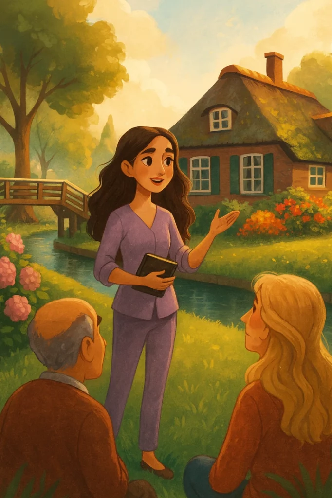 Hollanda’da Giethoorn Köyü’nde, bahçeli ve önünde kanal olan huzurlu bir evin önündeyim.