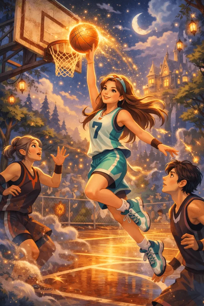 20’li yaşlarındaki Zeynep profesyonel bir basketbol sahasında rakipleriyle maç yaparken havaya sıçrayıp basket atıyor.